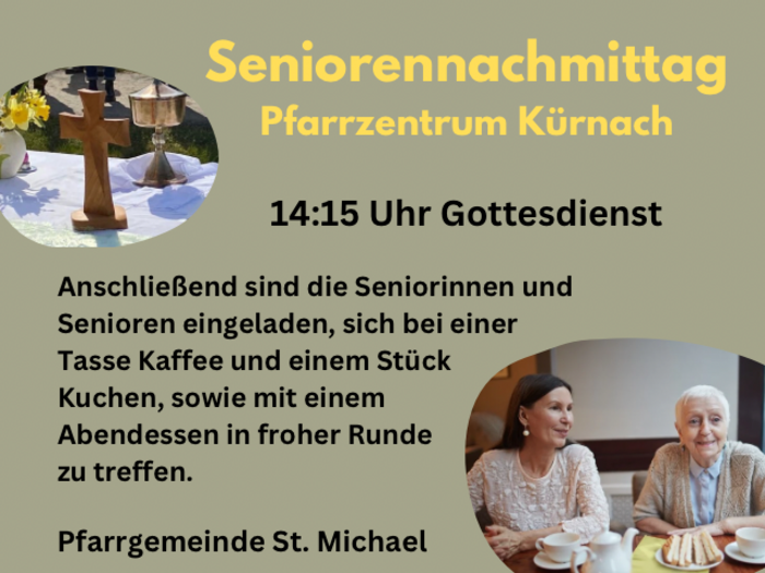 Gottesdienst um 14.15 Uhr im Pfarrzentrum, anschließend sind die Seniorinnen und Senioren eingeladen, sich bei einer Tasse Kaffee und einem Stück Kuchen, sowie mit einem Abendessen in froher Runde zu treffen.